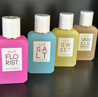 The Ellis Brooklyn fragrances all have a sleek glass bottle. I particularly seem to gravitate towards the frosted ones, as you can see from my bright and pastel lineup of bottles below. I like when you have multiple fragrances from one house, and can still easily tell which perfume you are reaching for by the design of the bottle. In addition, the caps are hefty and luxurious - they are made of Bakelite and have a strong magnet that clicks firmly into place. The signature metallic gold emblem/crest is visible and lightly embossed on the top. I must note that the label on my bottle of FLORIST was just the slightest bit off center, which was noticeable at first, but has ceased to be a bother to me and not worth stressing over. In the right light, you can see the metallic gold printing on the label.